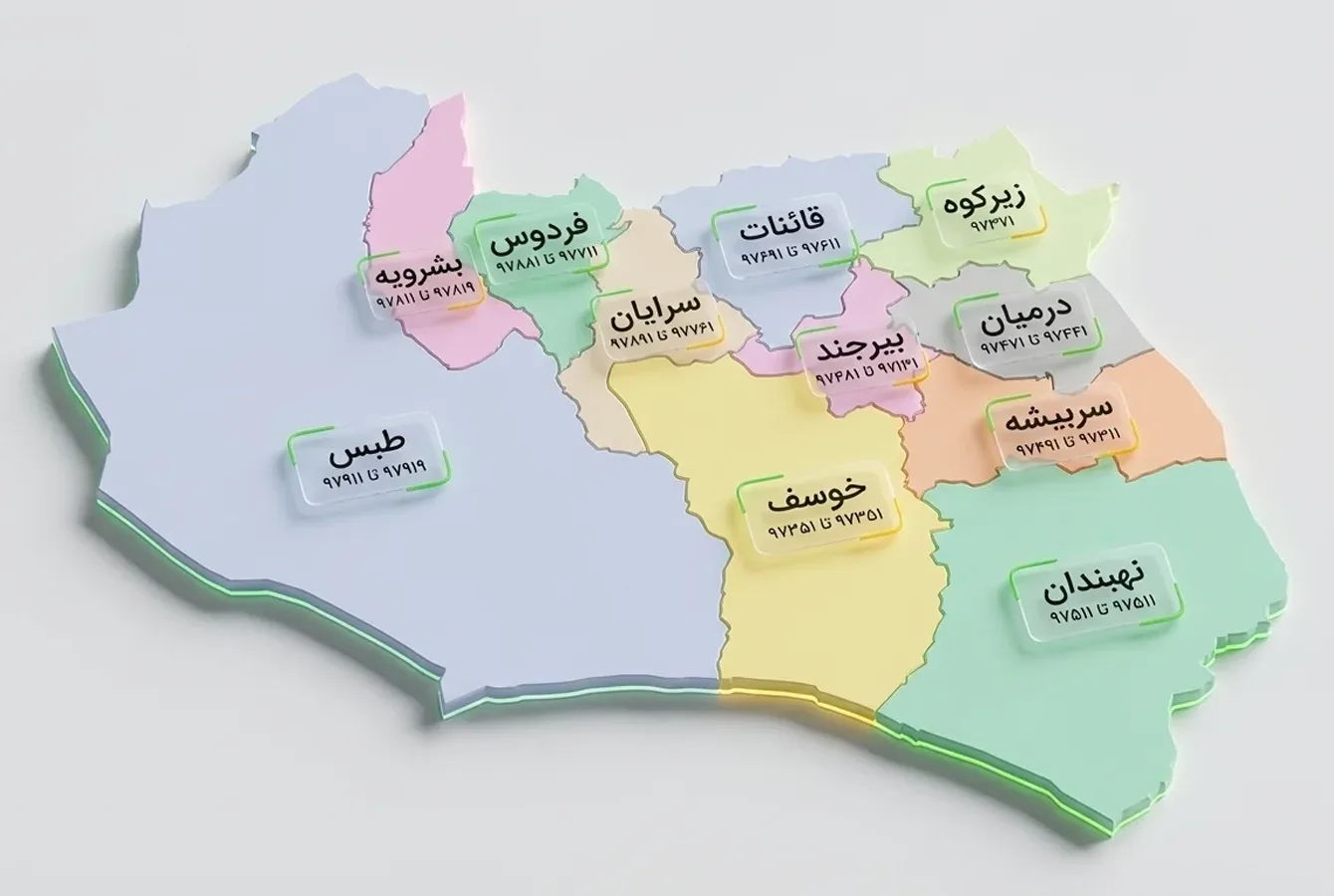 | قائنات | ۹۷۶۱۱ تا ۹۷۶۹۱ | شامل قاین، خضری، زهان و مناطق پیرامونی |