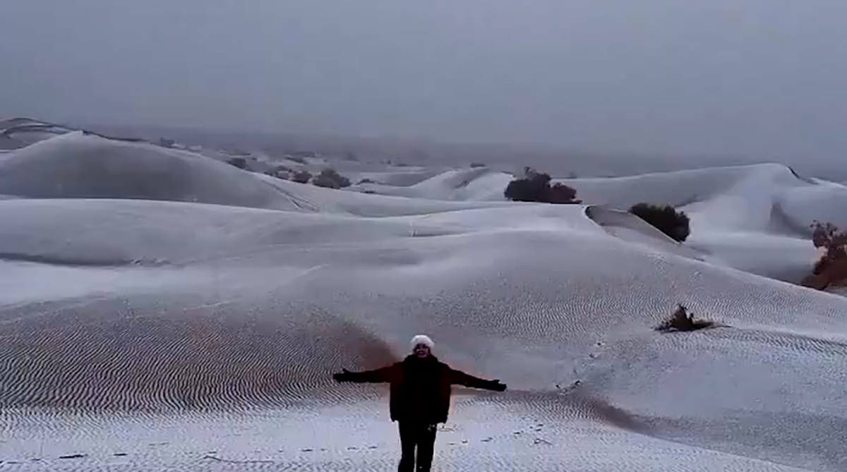 بارش سنگین برف باعث سفیدپوش شدن کویر مصر شد. این پدیده نادر را می‌بینید.