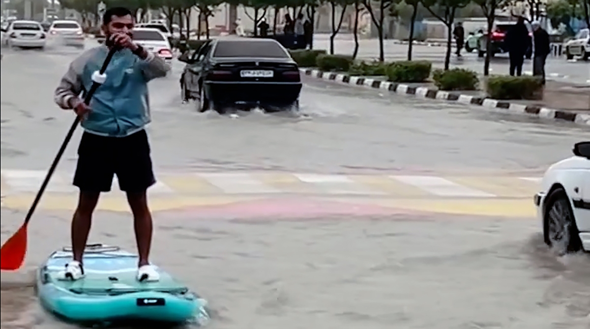تصاویری از تردد با تخته موج سواری در خیابان‌های کیش که بر اثر بارش شدید دچار آب گرفتگی شده، سوژه فضای مجازی شده است. این ویدیو را در مگ دید می‌بینید.