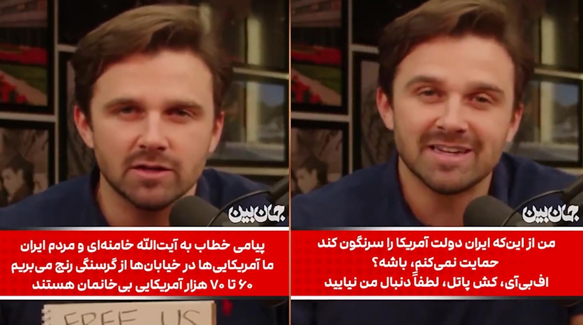 مفسر سیاسی در حالی که روی کاغذی به انگلیسی نوشته بود: «خامنهای ما را آزاد کن!» به سیاستمداران آمریکایی بخاطر دخالت در امور ایران طعنه زد. او گفت: «پیامی خطاب به آیت الله خامنه ای و مردم ایران. ما آمریکایی ها در خیابان ها از گرسنگی رنج می بریم. 60 تا 70 هزار آمریکایی بی خانمان هستند. ما به کمک شما نیاز داریم. ما آمریکایی ها از شما میخواهیم مردم آمریکا را از این رژیم فاسد آزاد کنید» با زیرنویس فارسی میبینید و میشنوید.