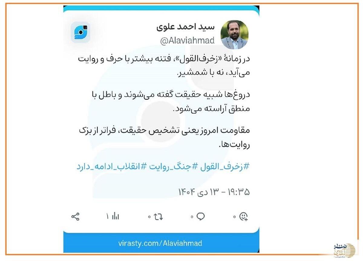 به گزارش خبرنگار فرهنگی صد آنلاین ، علوی با اشاره به مفهوم قرآنی و هشداردهنده «زخرف‌القول» نوشت: «در زمانه‌ای که فتنه بیش از آن‌که با شمشیر بیاید، با حرف و روایت می‌آید، مرز حق و باطل نه در صحنه نبرد، بلکه در میدان معنا تعیین می‌شود.»