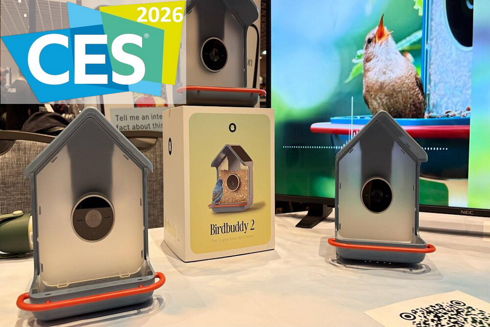 دو مدل دانه‌خوری هوشمند موسوم به «Birdbuddy» به نمایشگاه CES آورده شده است که می‌تواند پرندگان را از روی آوازشان شناسایی کند.